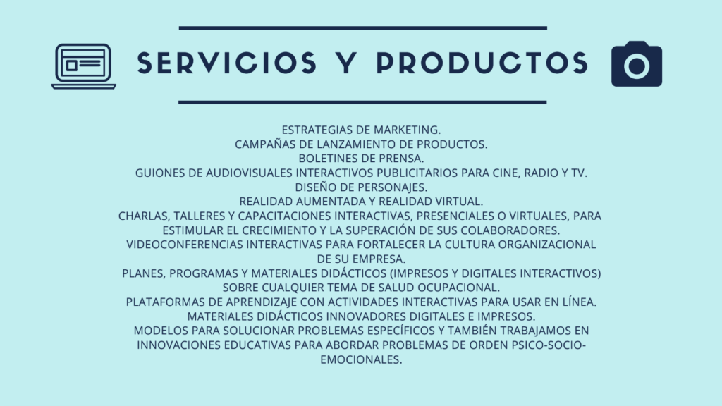 - Producción de Fotografía, Audiovisuales, Spots, Documentales corporativos, informativos y publicitarios.